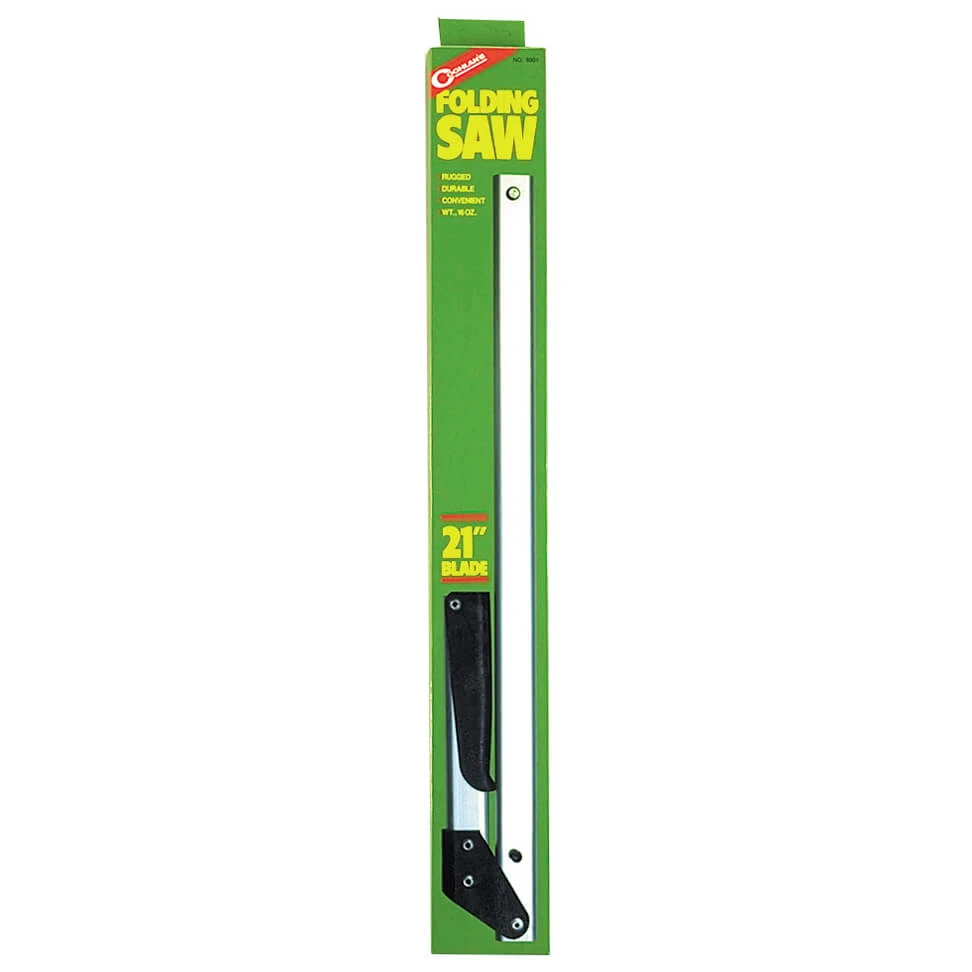 Wer beim Campen schon mal mit dickeren Bäumen zu tun hat, für den ist die Faltsäge von Coghlans vielleicht das richtige. Denn mit ihrem 53 cm langen Sägeblatt, kann man sich spielend leicht auch durch dickes Holz arbeiten. Sollte man sich also einen zusätzlichen Unterstand bauen wollen oder einfach eine ordentliche Portion Feuerholz zubereiten möchte, ist man mit der Faltsäge von Coghlans bestens bedient. Das Sägeblatt lässt sich komplett im Alurahmen verstauen.