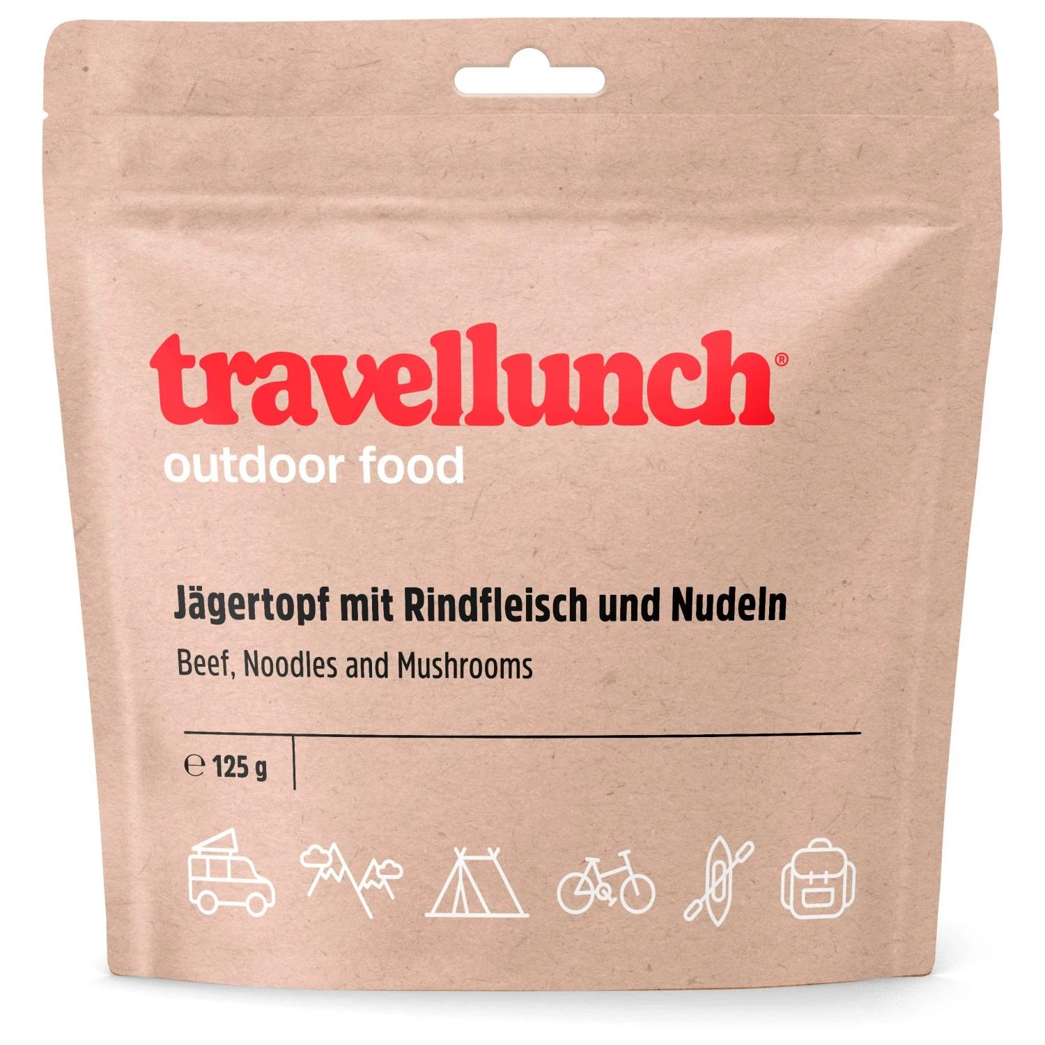 Ideal für Touren, bei denen jedes Gramm ins Gewicht fällt: Outdoor Nahrung von Travellunch, für eine ausgewogene Ernährung on Tour! Um nach anstrengenden Tagen in Bergen, Gletschern oder am Kletterfels wieder zu Kräften zu kommen, bietet Travellunch vollwertige Mahlzeiten aus gefriergetrockneten Zutaten, die durch geringes Gewicht und Volumen punkten. Neben abwechslungsreichen Hauptgerichten gibt es auch Frühstück, Desserts und Getränke. Die Gerichte sind geschlossen und ungekühlt für ca. 2 Jahre haltbar und lassen sich einfach zubereiten: angegebene Menge heißes Wasser in die Packung geben, verschließen und einige Minuten ziehen lassen (genaue Zeit ist auf der jeweiligen Verpackung angegeben) – fertig! Den Jägertopf mit Rindfleisch und Nudeln gibt’s als 125 g (ergibt ca. 500 g) und 250 g (ergibt ca. 1000 g) Packung. Die große Packung ergibt zwei kleine Portionen. Bei großem Hunger oder hohem Energiebedarf sollte man aber doch eine komplette 250 g Packung pro Person rechnen! Zutaten: Nudeln (Hartweizengrieß, Hühnereiweiß, Salz), Bratensauce, Rindfleisch (8%), Fett pflanzlich gehärtet, Röstzwiebeln, Butterpulver, Kartoffelstärke, Molkenerzeugnis, Tomatenpulver, Sahnepulver, Salz, Champignons, Kräuter, natürliche Aromen, Gewürze.