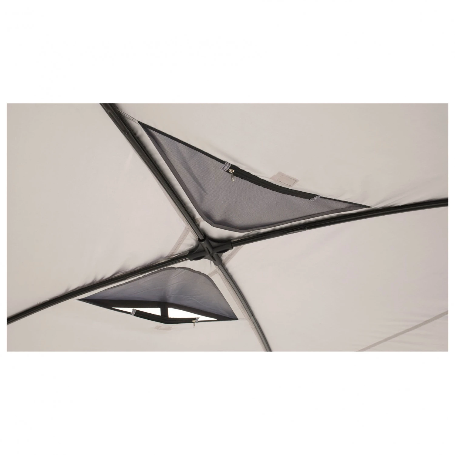 Mit Outtex 1500 Pro Silver ist das Material stark wasserabweisend, also ein sicherer Schutz vor einem leichten Niederschlag. Zudem schützt das Zelt zuverlässig vor Sonneneinstrahlung und spendet angenehmen Schatten. Über alle Seiten hat man einen ungehinderten Zugang zum Zelt. Die durchdachte Konstruktion garantiert eine komfortable Kopffreiheit und einen großzügigen Wohnraum ohne seitliche Einschränkungen. Praktisch ist die Befestigungsmöglichkeit für Lampen an der Decke. Das sorgt bei Bedarf für mehr Wohnlichkeit. In den Innentaschen lassen sich Kleinigkeiten praktisch verstauen.