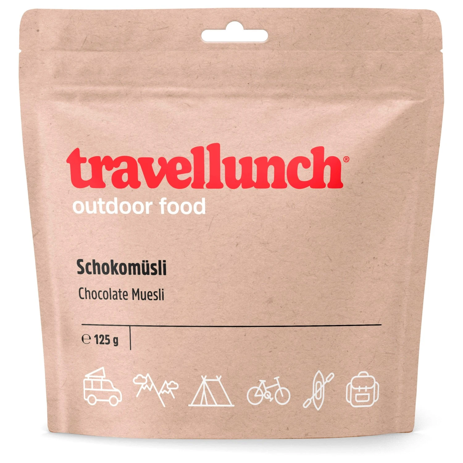 Ideal für Touren, bei denen jedes Gramm ins Gewicht fällt: Outdoor Nahrung von Travellunch, für eine ausgewogene Ernährung on Tour! Um nach anstrengenden Tagen in Bergen, Gletschern oder am Kletterfels wieder zu Kräften zu kommen, bietet Travellunch vollwertige Mahlzeiten aus gefriergetrockneten Zutaten, die durch geringes Gewicht und Volumen punkten. Neben abwechslungsreichen Hauptgerichten, Desserts und Getränken, gibt es auch Leckeres für’s Frühstück. Ob deftig oder süß – hier findet jeder den passenden Morgen-Imbiss für unterwegs. Die Gerichte sind geschlossen und ungekühlt für ca. 2 Jahre haltbar und lassen sich einfach zubereiten: angegebene Menge heißes/ kaltes Wasser in die Packung geben, verschließen und einige Minuten ziehen lassen (genaue Zeit ist auf der jeweiligen Verpackung angegeben) – fertig! Für alle, die schon morgens gerne naschen: Schokomüsli mit Milch als 125 g oder 250 g Packung. Genug Energie für einen guten Start in den Tag! Zutaten: Vollkorn-Haferflocken, Vollmilchpulver, Zucker, Kakaomasse, Hafervollkornmehl, Honig, Weizenmehl, Haselnüsse, Kakaobutter, Kakao, Maltodextrin, Maisstärke, Gerstenmalzextrakt, Molkenpulver Haselnußkrokant, Salz, Emulgator: Lecithin, Aromen.