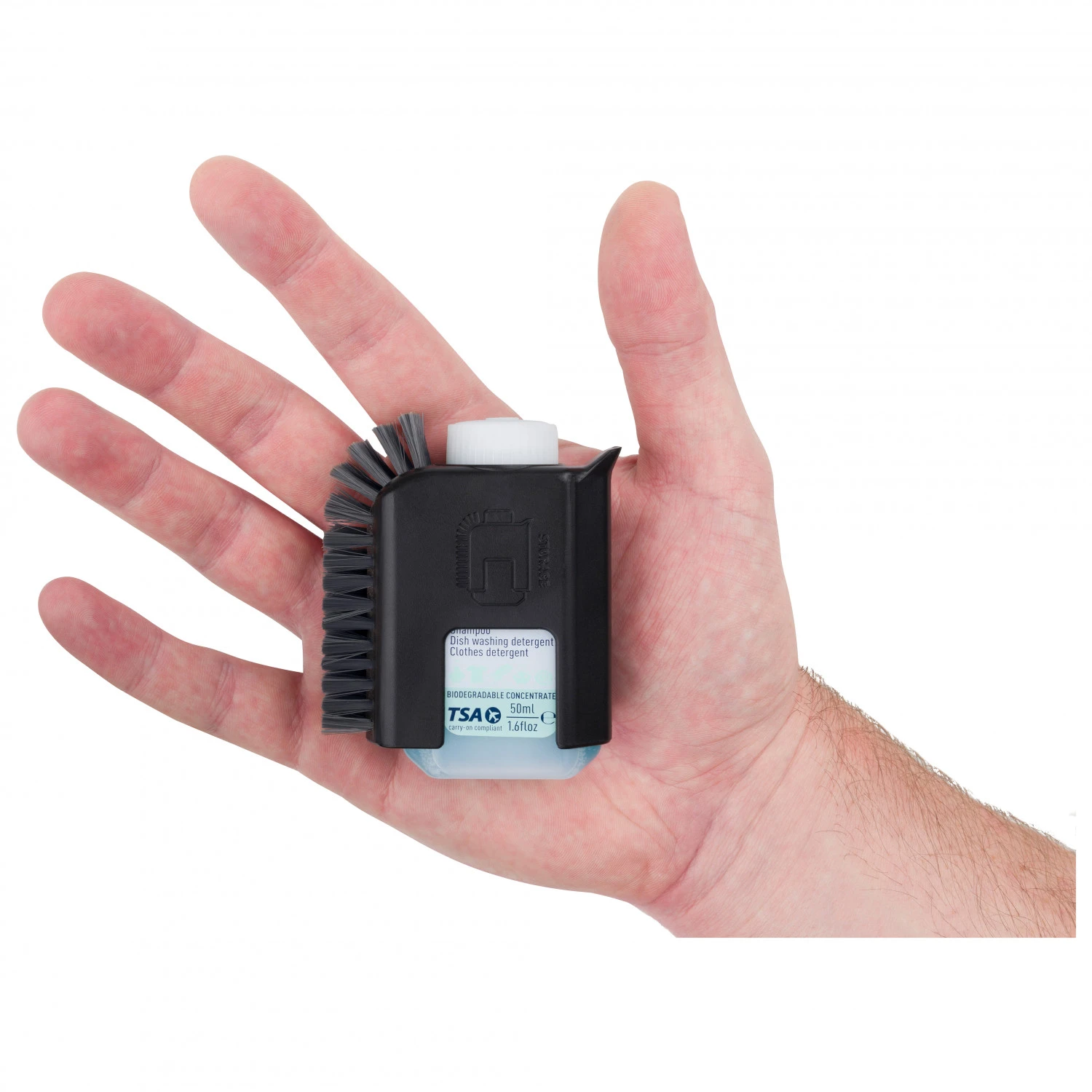 Deine Campingtöpfe werden mit dem Camp Kitchen Pot Scrubber von Sea to Summit zuverlässig sauber! Die mitgelieferte Wilderness Wash Seife ist effizient und zudem biologisch abbaubar. Die Bürste löst auch hartnäckige Essensreste zuverlässig. Die Seife lässt sich in der Bürste verstauen. Praktisch!