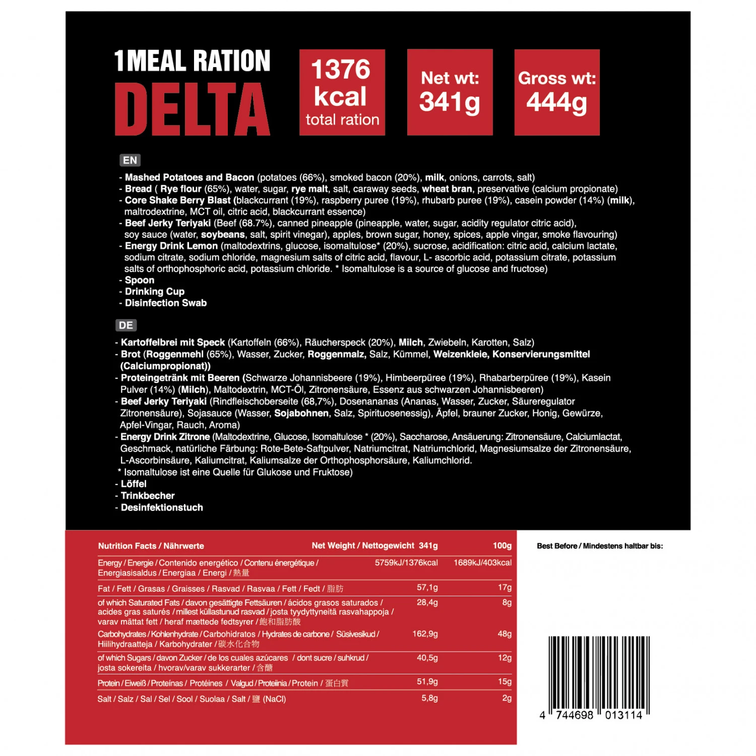 Der TACTICAL FOODPACK Ration Delta enthält eine Hauptmahlzeit, verschiedene Snacks und ein Getränk.